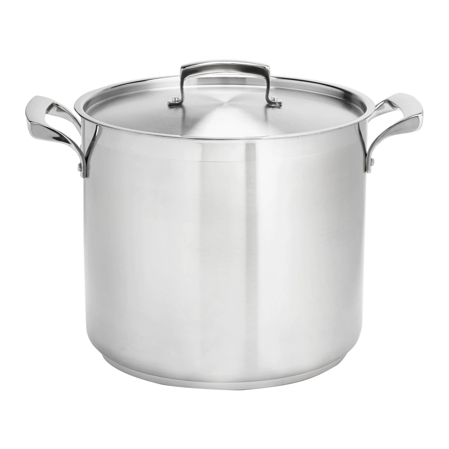 This Thermalloy® 100 quart stock pot can handle the biggest jobs. The aluminum bottom provides even heat distribution and the hollow handle stays cool. It has a limited lifetime warranty. For best results, Thermalloy® stainless steel cookware should be pre‐seasoned prior to use. Pre‐seasoning Instructions: After cleaning and drying, coat the cookware lightly with vegetable oil or a small amount of shortening. Place on medium heat burner for 10 to 15 minutes until light smoke appears. Turn off heat and allow pan to cool and wipe off excess oil with a paper towel.