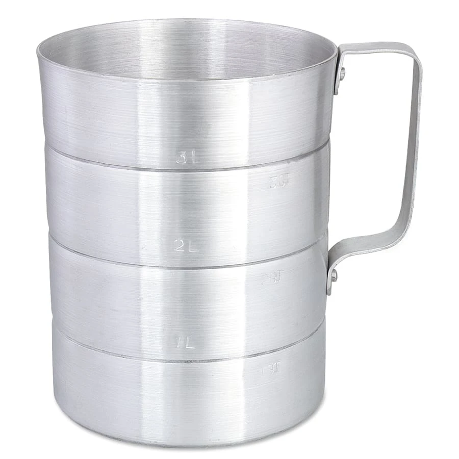 This Browne Foodservice 4 quart dry measuring cup can handle the big jobs. It has a seamless, heavy‐duty aluminum construction with riveted handles.