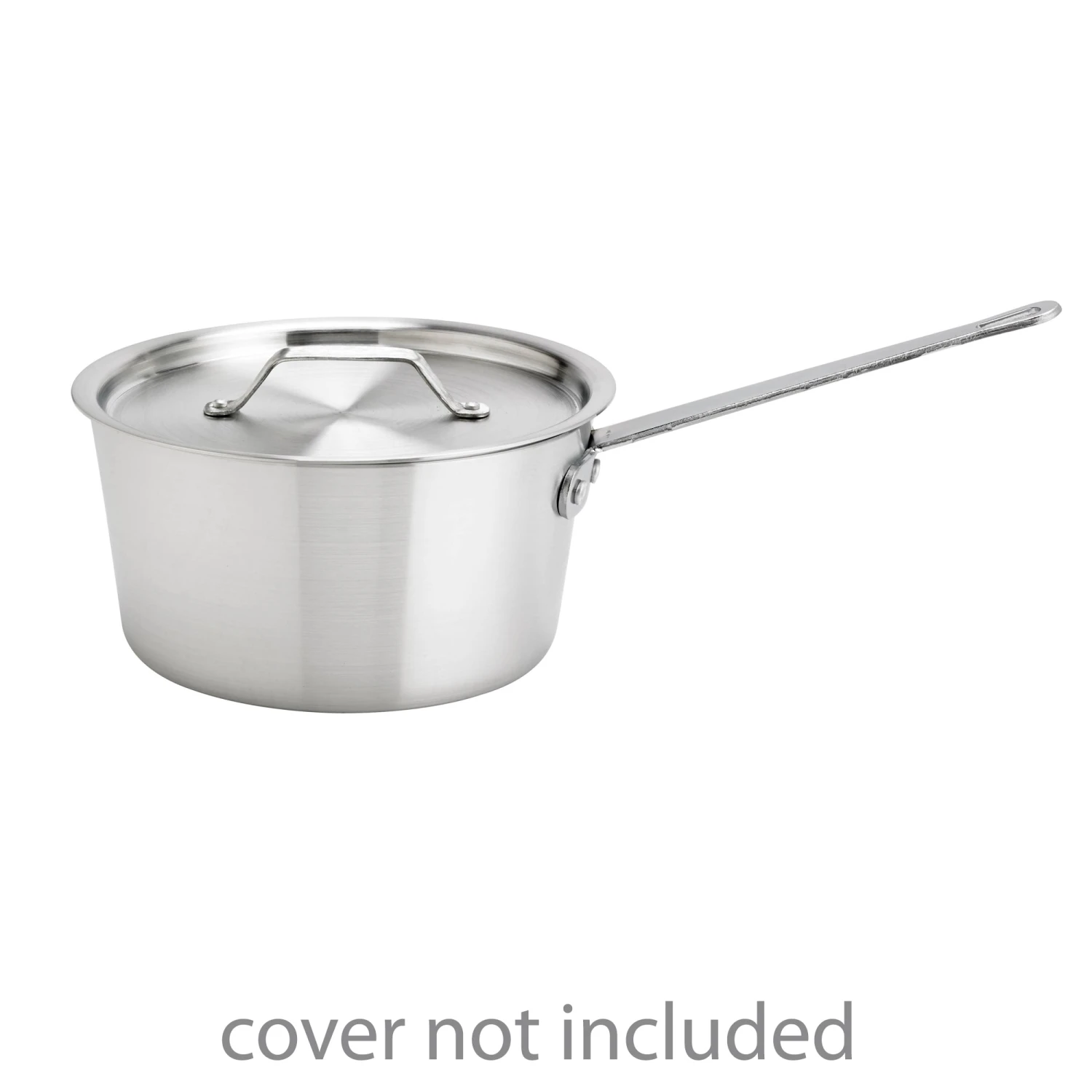 This durable standard weight tapered sauce pan from Browne Foodservice has a capacity of 3.5 quarts and features 9 gauge aluminum construction with excellent heat conductivity. Perfect for any kitchen! For best results, Thermalloy® aluminum cookware should be pre‐seasoned prior to use. Pre‐seasoning Instructions: After cleaning and drying, coat the cookware lightly with vegetable oil or a small amount of shortening. Place on medium heat burner for 10 to 15 minutes until light smoke appears. Turn off heat and allow pan to cool and wipe off excess oil with a paper towel.