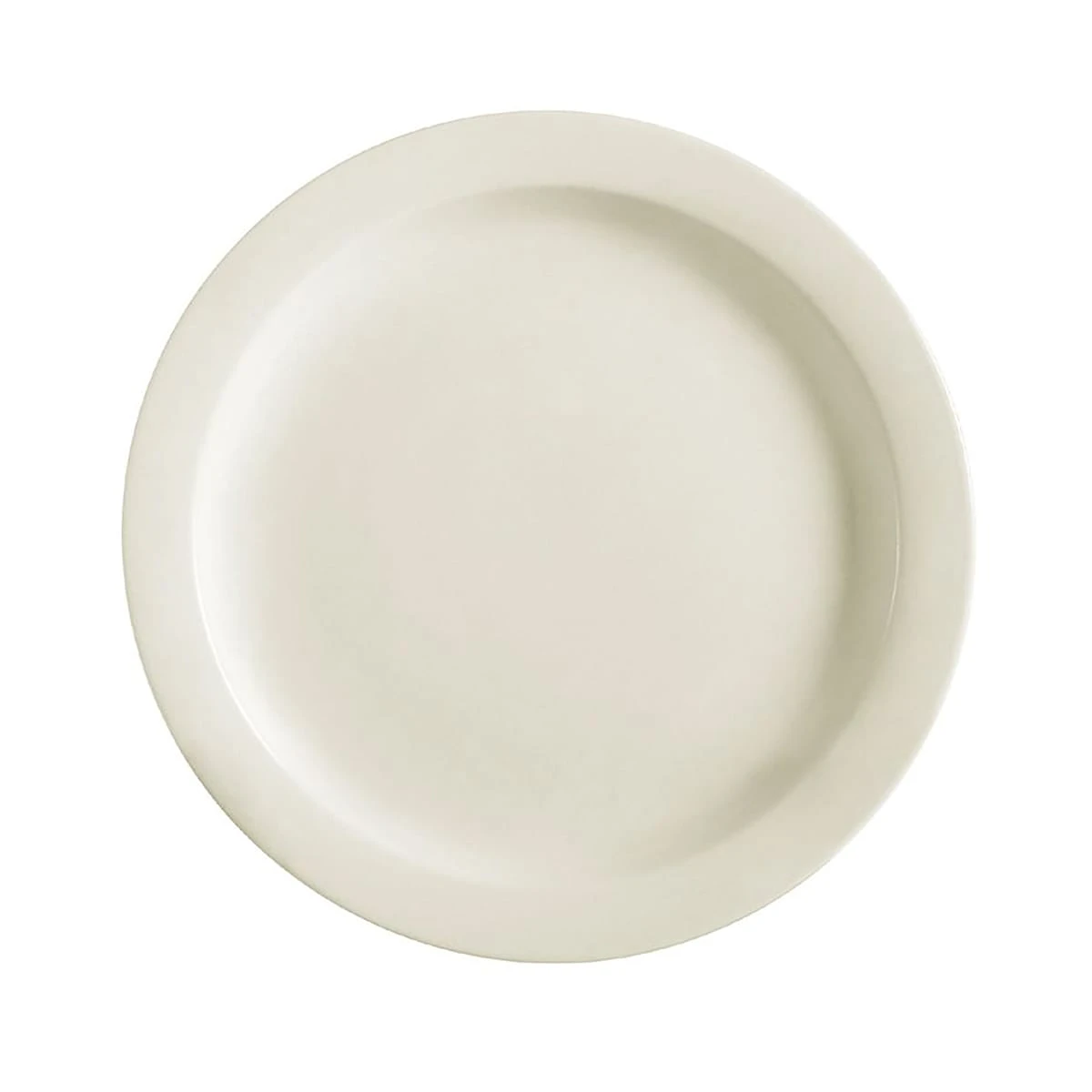 This American White plate from CAC features a narrow rim and is dishwasher, oven, and microwave safe.