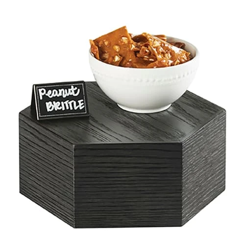 This 5″ tall Cinderwood Hex agon Riser from Cal‐Mil features an elegant dark‐stained oak finish and is perfect for displaying appetizers, desserts and other delicious foods.