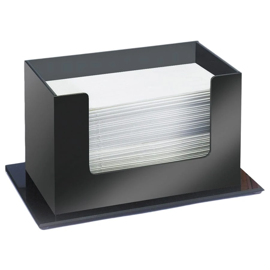 This holder holds standard size paper towels for use is restrooms. It has three enclosed sides and a semi‐enclosed front keep towels in place.