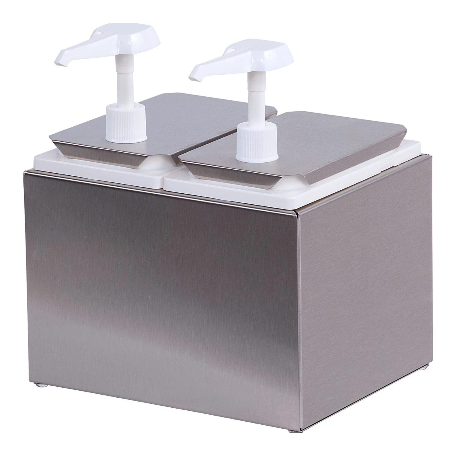 This 2 pump topping rail from Carlisle® is perfect for dispensing condiments, sauces or dressings. It is made of long lasting stainless steel and the rubber feet protect the counter and prevent slipping. This topping rail includes two, 300‐R pumps and two, 2‐1/2 quart fountain jars.