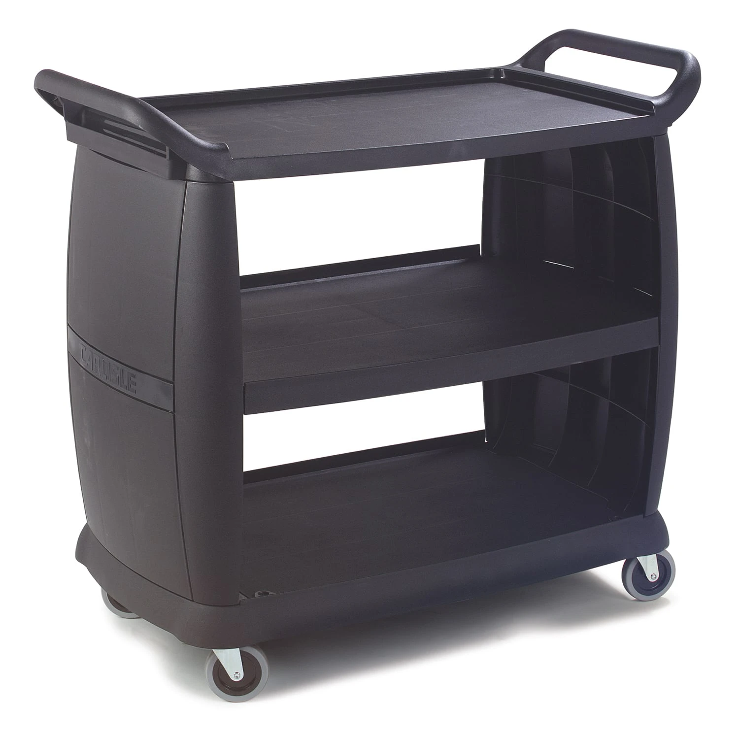 This large black bussing cart can be used for front of the house serving, bussing, or even room service applications. It has a weight capacity of 300 lbs. and the shelves and top are textured for a better grip and to minimize scratches.