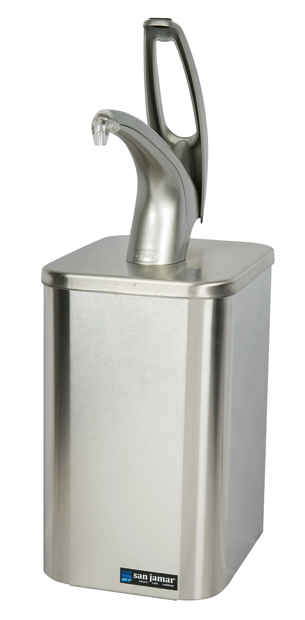 This San Jamar FrontLine™ Universal Condiment System includes a Soft Touch™ Pump that delivers consistent 1 Ounce portions and can dispense condiments, sauces, and dressings. Use a 1.5 gallon Cryovac® bag, 1 Gallon jar, #10 can or jar, or direct pour. It has a sleek, low-profile design that is ideal for restaurants and concession areas.