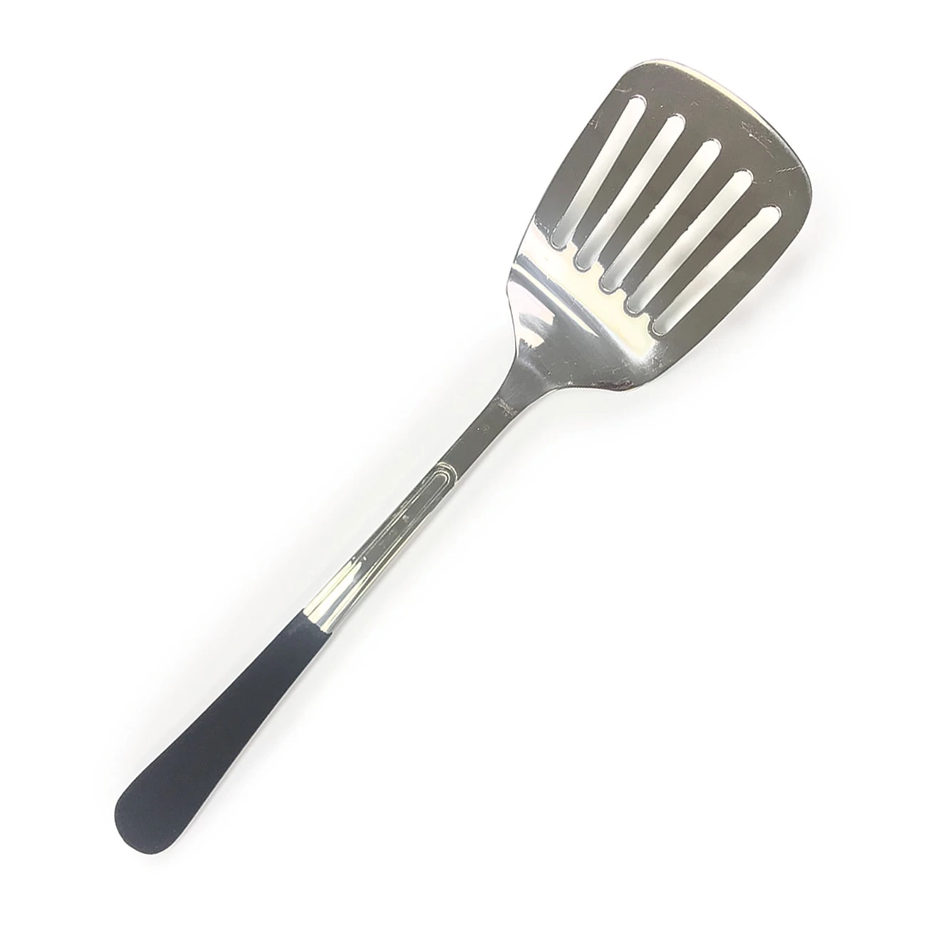 This 13.5″ stainless steel slotted spatula from G.E.T. Enterprises features a cool-grip handle and is commercial dishwasher safe.
