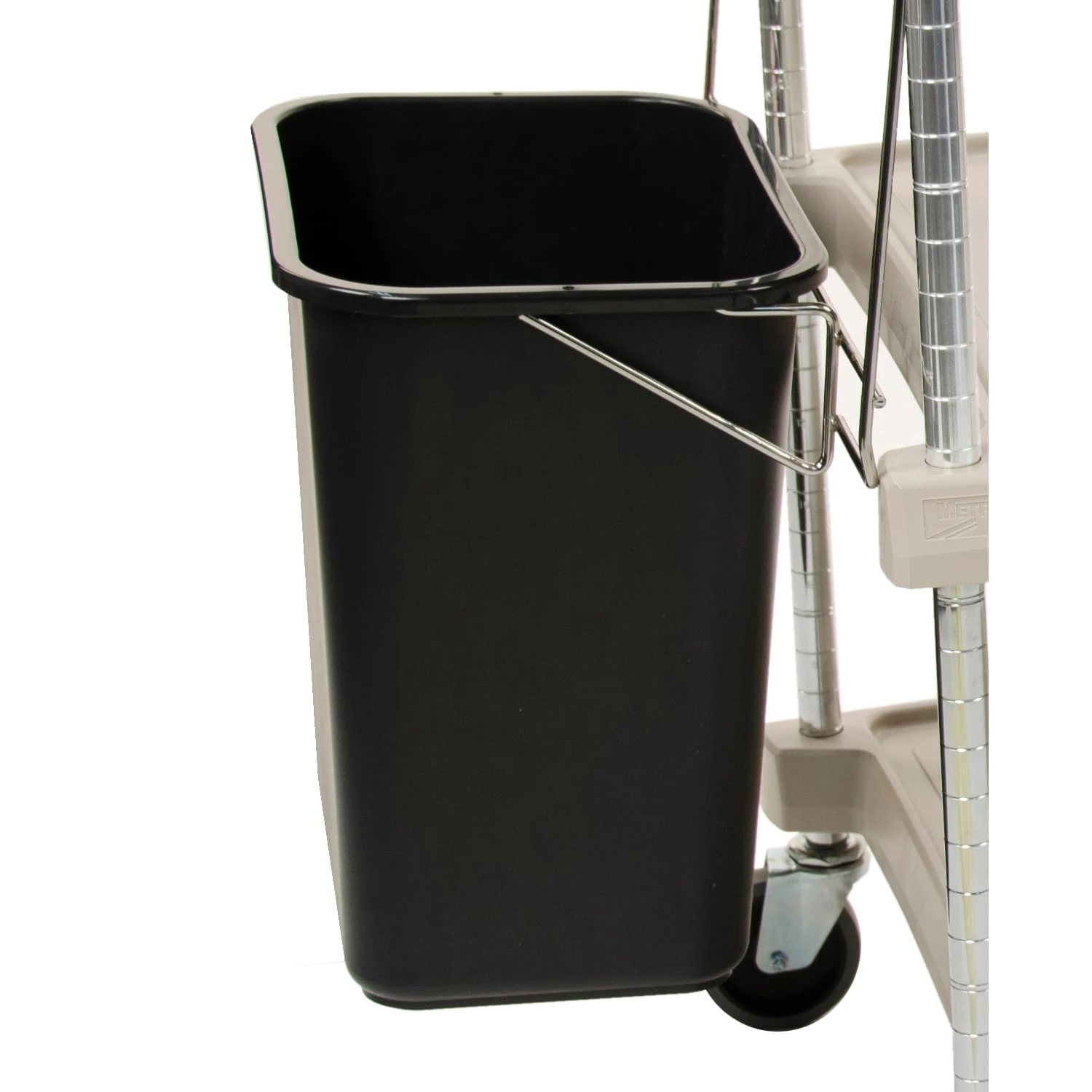 This black waste basket from Metro includes the holder and fits the myCart MY2030 cart.