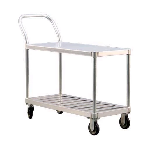 These carts are welded aluminum for durability. The solid top carts have a marine edge to help contain spills. The T-Bar top carts provide air circulation.