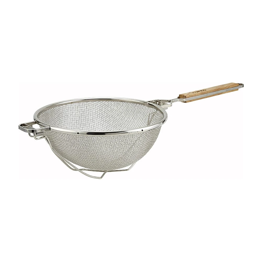This nickel-plated reinforced double mesh strainer from Winco® is 10.5″ round and features a flat handle.